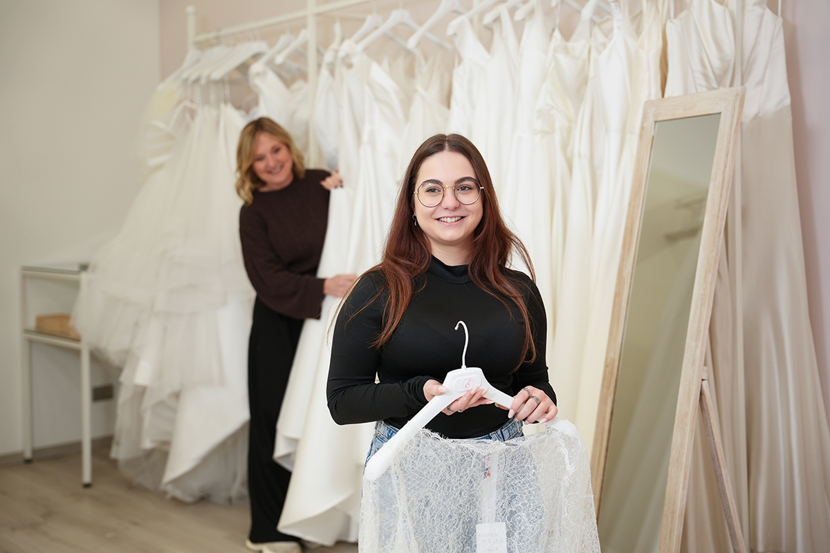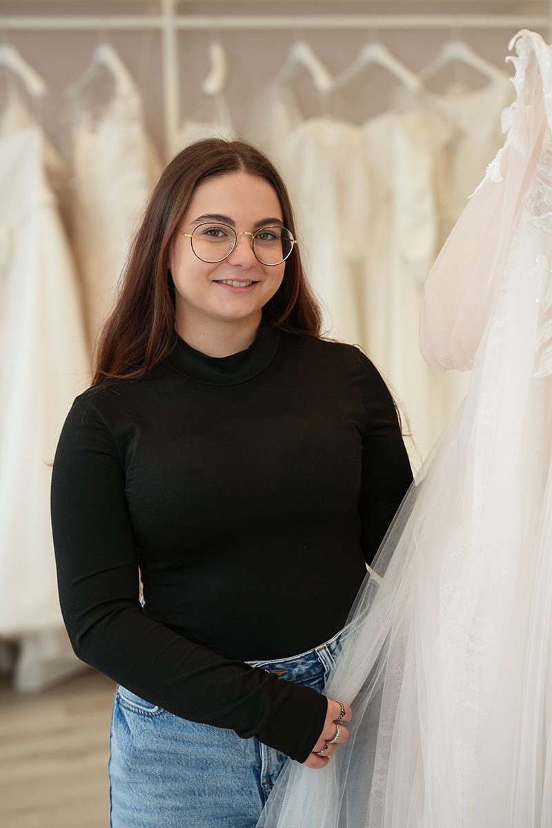Grazie alla scuola, Aurora ha avuto l’opportunità di candidarsi al progetto “Una scuola, Un Lavoro” di Fondazione Cologni, che le ha permesso di intraprendere un tirocinio formativo di sei mesi, iniziato a gennaio 2026, presso l’Atelier Alta Moda Sposa di Montegranaro (FM), che si distingue per la realizzazione di abiti da sposa senza taglia, interamente realizzati su misura, permettendo così anche alle donne curvy di sentirsi valorizzate e speciali nel loro giorno più importante. Grazie alla titolare e tutor Cinzia Pizzichini, Aurora ha la possibilità di conoscere il vasto mondo dei tessuti e le varie tecniche sartoriali e di confezione.